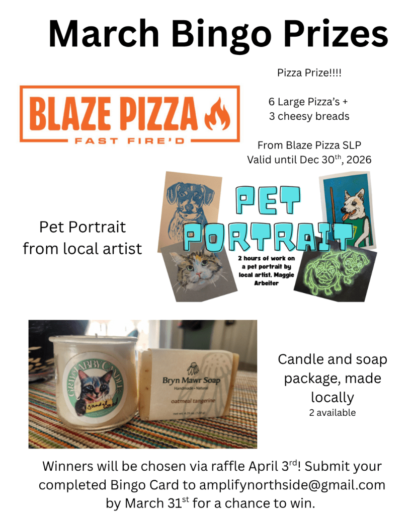 1 Line Bingo Prize runners-up (2 available): Handmade soy candle (choice of scents) from Gray Tabby Candle Co and a bar of Bryn Mawr Soap. Both made locally on the Northside!